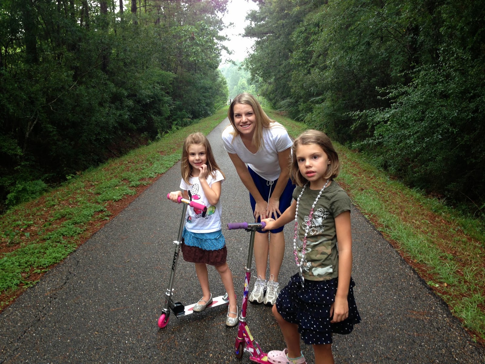 On our walk I noticed a lot of growth I haven't seen before. Honeysuckles, and blackberries! We started picking some berries and putting them in baskets to make blackberry cobbler. Ellia also came with me off the bike trail on the horse trail to check for more. It was pretty swampy and kindof eerie. I just kept thinking of water moccasins and other snakes. By the time it connected again with the main trail we were done with adventures for the day...plus we didn't really get any extra blackberries.